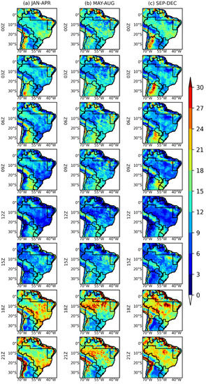 Spatial distribution of PFclim,i(%) obtained from the 3-h integrated multi-satellite retrievals for GPM (IMERG) product precipitation estimates for the period of 2000–2019 over the BR region from 00Z to 21Z. (a) January to April; (b) May to August; (c) September to December. Note that, in general, the convection generates a maximum of precipitation in the afternoon and a minimum in the morning on continental areas.