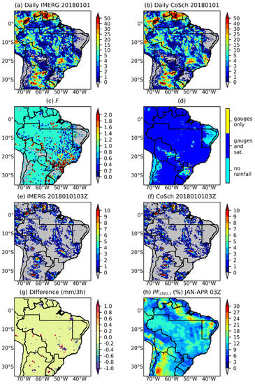 The steps required to create the CoSchB version product with IMERG and CoSch datasets for 01/01/2018 at 03Z. From the daily products of (a) IMERG and (b) CoSch (c) the conversion factor F is calculated and applied to (e) the 3-h IMERG product resulting (f) the blended 3-h CoSchB product. Panel (d) shows the grid state regarding daily rainfall measurement data. In the grid points without satellite information (i.e., gauges only), the CoSch daily values are multiplied by the (h) PFclim,i values where i here is for 03Z. The difference between the 3-h version of IMERG and CoSch is also displayed in (g).