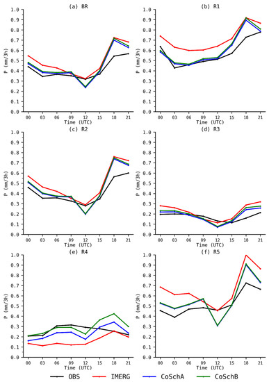 Mean precipitation diurnal cycle (PDC) comparing the satellite precipitation products IMERG (red), CoSchA (blue), CoSchB (green), and the rain gauges (OBS) data for the 2015–2018 period over all regions covered at Figure 1. The panels show the results for each region, (a) for BR, (b) for R1, (c) for R2, (d) for R3, (e) for R4, and (f) for R5.
