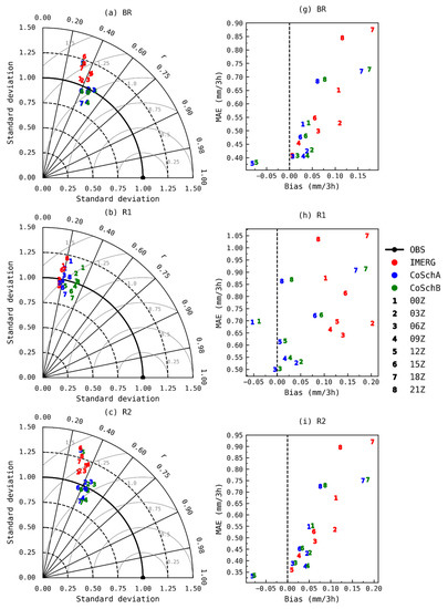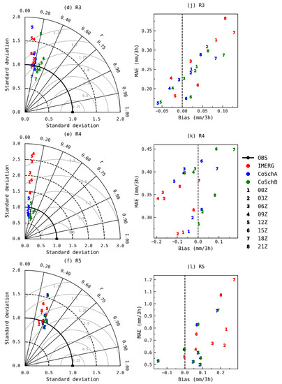 Taylor diagrams (a–f) showing the normalized standard deviation, root mean square error (RMSE) and the r values of mean precipitation (mm/3 h) for the 2015–2018 period between the satellite precipitation products IMERG (red), CoSchA (blue), CoSchB (green), and the rain gauges (OBS) over all regions covered at Figure 1. Panels (g–l) also show the mean absolute error (MAE) and bias values. The numbers represent the results for different times (UTC), 1 for 00Z, 2 for 03Z, 3 for 06Z, 4 for 09Z, 5 for 12Z, 6 for 15Z, 7 for 18Z, and 8 for 21Z.