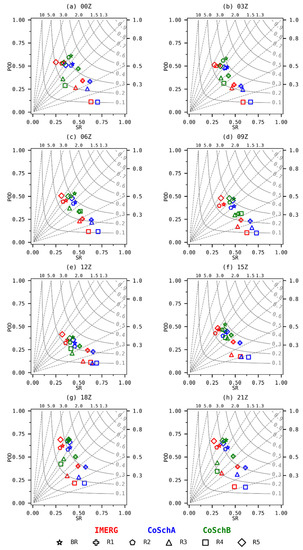 Performance diagrams summarizing probability of detection (POD), SR, CSI, and bias score (BSCORE) between the satellite precipitation products IMERG (red), CoSchA (blue), CoSchB (green), and the rain gauges data for the 2015–2018 period over all regions covered at Figure 1. Each region is represented by a symbol. The panels show the results for different times (UTC), (a) for 00Z, (b) for 03Z, (c) for 06Z, (d) for 09Z, (e) for 12Z, (f) for 15Z, (g) for 18Z, and (h) for 21Z.
