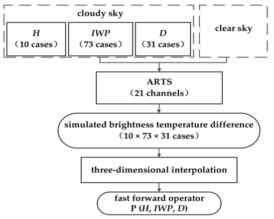 Figure 2 depicts a basic flowchart for the construction of the fast forward operator. First, different ice cloud scenes were selected for simulations. Specifically, a total of 10 cases of cloud heights were selected, which were 6.5, 7.0, 7.5, 8.0, 8.5, 9, 9.5, 10, 10.5 and 11 km, respectively. The low ice water paths were dense, 1–20 g/m2 for every 1 g/m2, and the high ice water paths had a relatively low density of 20–100 g/m2, taken for every 10 g/m2, and 100–1000 g/m2, taken for every 20 g/m2, for a total of 73 cases. The values of the effective particle diameters were 2 μm and 10–300 μm for every 10 μm, for a total of 31 cases. Then, ARTS was applied to simulate the nadir brightness temperature of different channels in 10 × 73 × 31 = 22,630 combined ice cloud scenes. Simultaneously, the nadir brightness temperatures in the clear sky scenes were also simulated. Thus, a total of 22,630 cases of brightness temperature differences of different channels could be calculated. Thirdly, 3D interpolation was used to construct the forward operator P (H, IWP, D), as shown in (2). When inputting the H, the IWP and the D, the corresponding brightness temperature difference I (H, IWP, D) of different channels can be quickly obtained.