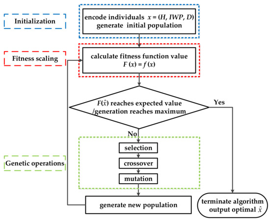 The genetic algorithm (GA) is a metaheuristic algorithm inspired by the process of natural selection. It was first proposed by Holland [38] in 1975 and was then summarized by DeJong and Goldberg et al. [39,40]. The GA is commonly used to generate high-quality solutions to optimization and search problems. The principle of GA is based on the concept of Darwin’s theory of evolution. It encodes the parameters of the problem into chromosomes and then uses iterative methods to select, cross and mutate the genes to allow for the exchange of this information within a population. Generally, the algorithm comes to an end when either the maximum number of iterations has been reached or the satisfactory fitness of the population has been satisfied. A chromosome that meets the optimization goal is finally generated. The processes of the GA can be divided into three steps: initialization, fitness scaling and genetic operations. Figure 3 depicts a basic flowchart of the intelligent inversion of ice cloud parameters based on the GA and each step is defined in detail below.