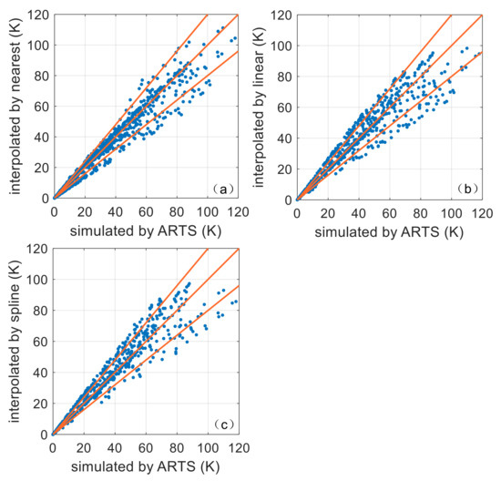 Figure 4 depicts the scatter plots of the brightness temperature differences simulated and the three interpolated brightness temperature differences, with a critical relative error in interpolation boundary of 20% compared with the simulations. The nearest interpolation method was the best of the three methods, and the proportion of the points within the 20% relative error was 81.2%, whereas the proportions of the linear interpolation and spline interpolation were 64.0% and 59.2%, respectively. In addition, the inversion test showed that the nearest interpolation was more efficient than the other two methods.