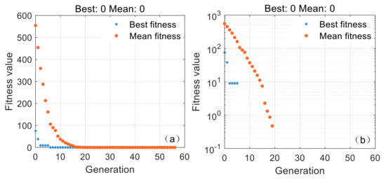 For the sake of verifying the effectiveness of the inversion algorithm based on GA, an ice cloud scene with altitude of 8.5 km, IWP of 400 g/m2 and effective particle diameter of 200 μm was chosen for a case study. The variation in the fitness function value during the inversion search is shown in Figure 5, where the abscissa is the evolutionary generation and the ordinate is the fitness function value, including the mean fitness function value of the population and the best fitness function value of the optimal individuals. Figure 5a,b are the curves of the fitness function value, where the coordinates are taken on a normal scale and logarithmic scale, respectively. The figures show that in the early stage of evolution, when the individual was far from the ideal value, the optimal solution rapidly improved. In the later stage of evolution, the population evolved slowly and it stagnated when the population evolved to 20 generations. With further increases in generations, the fitness function values of the optimal individual found by the GA was continuously reduced to around 0, and the algorithm stopped at around 55 generations. The ice cloud height, ice water path and effective particle diameter obtained at this time were 8.4984 km, 402.2138 g/m2 and 196.3625 μm, respectively, indicating that the genetic algorithm is not limited by the local optimal solution and can effectively find the optimal solution.