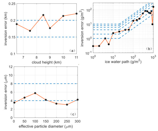 Figure 6 shows the retrieval performance based on the GA for the different ice cloud parameters. Figure 6a displays the MAEs for the different cloud heights. Figure 6b presents the median error for the different ice water paths. The MAEs of 1, 2, 4, 6, 8 and 10 g/m2 are marked with dashed lines for the low ice water path below 20 g/m2, and the MREs of 5%, 10%, 20%, 30%, 40% and 50% are marked with dashed lines for the high ice water path above 20 g/m2. Figure 6c demonstrates the MAEs for the different effective particle diameters. The absolute errors for the cloud height remained at around 0.2 km, with a minimum value of 0.1686 km. The absolute errors of the low ice water path, which were below 20 g/m2, remained within 3 g/m2. Moreover, the relative errors for the high ice water paths were generally maintained at around 10%, with a maximum value of 18.3627%. The absolute errors of the effective particle diameters were mostly maintained at around 4 μm and the maximum was 4.7075 μm when the diameter was 100 μm.