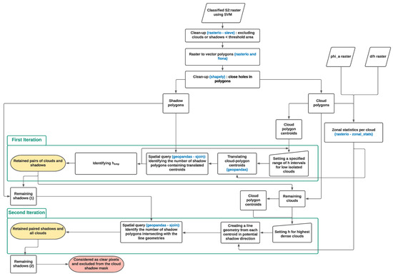 Images of potential φa and d/h are calculated using the 10m pixel size of view and sun angle data of each image using the SNAP–ESA Sentinel Application Platform (http://step.esa.int). These images, in addition to the classification results, are the main input to the geometry-based improvement of the classified shadows that in turn is carried out using the python libraries Rasterio [58], Rasterstats [59], Shapely [60], Geopandas [61] along with Numpy, Pandas, and their dependencies. Figure 5 shows an overview of the geometry-based approach.