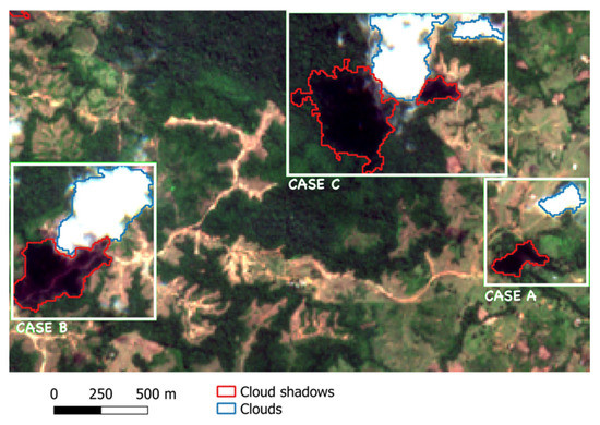 Examples of clouds and their shadows illustrating their possible separation and adjacency using a Sentinel-2 image of the study area.