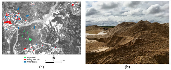 Informal small-scale alluvial gold mining, also known as placer mining, has major social and environmental impacts and has been at the heart of complicated armed conflicts in various parts of the world. It is distinct from subsistence mining as it utilizes large machinery to excavate soil and river sediment [1]. When carried out on the riverbanks, it leaves large footprints of bare soil along with ponds of water that are utilized for on-site processing [2,3]. Such ponds are required to pump ore slurry and wash it through sluice boxes under pressure where the gold particles are collected. Prior to the 2018 mercury ban [4], amalgamation was intensively used to improve the capture of the finest gold particles leading to major health hazards [5]. This law was implemented for the mining sector, but it has not been well enforced, resulting in illegal mercury markets that supply illegal/informal mining [6].