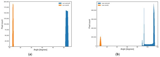(a) Sun and (b) sensor viewing angles for the study area of the Sentinel-2 image acquired on 18 June 2019.