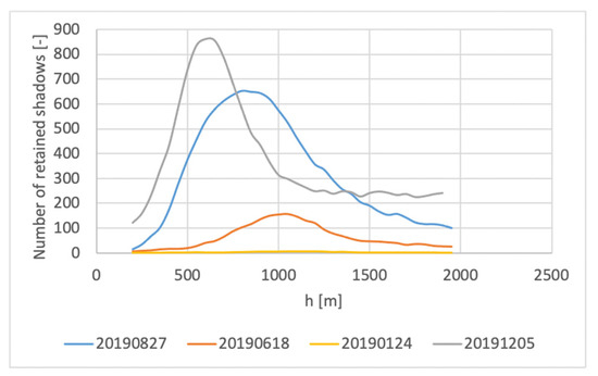 Three images of different seasons and various cloud cover were used to assess the methodology with diverse cloud cover and solar and view angle conditions. The SVM classification model built by the reference spectra of 18 June 2019 was used to classify the three images. An overview of parameters needed for potential shadow locations are shown in Table 4. A range of h and the corresponding retained shadow polygons is shown in Figure 11 where the value corresponding to the highest number of detected shadows hemp is considered and shown in Table 4. Figure 12 shows the results of the three images.