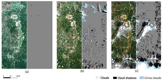 Sentinel-2 RGB view of the three images and their corresponding detected dense clouds, and cloud shadows, along with cirrus cloud provided by Sen2Cor (a) 24 January 2019, (b) 27 August 2019, and (c) 5 December 2019.