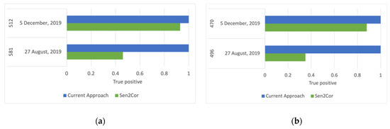 True positives of visually detected using the current approach compared to Sen2Cor (a) dense clouds (512 and 581 reference pixels as indicated in the first column) and (b) shadows (470 and 496 reference pixels as indicated in the first column).
