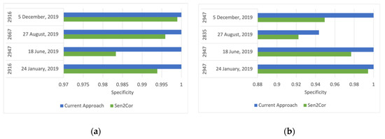 Even though clouds contaminated the pilot site on only two dates, the possible false positive detection of clouds and shadows can be present on all four images. As the interest is also in the reduction of misclassification of water bodies and mining sites as clouds and shadows, Table 6 and Table 7 show the “total negative” mining and water pixels (clear pixels) and detail any false positive detection by the current approach or by Sen2Cor. Specificity is reported in Figure 15 where Specificity = Neg/(Neg + F), where Neg is the number of total negatives, and F is the number of false positives. Specificity using the current approach reaches 1 for most cases and is constantly higher than Sen2Cor’s detection (considering high and medium probability clouds), even with Sen2Cor’s low detection rate.