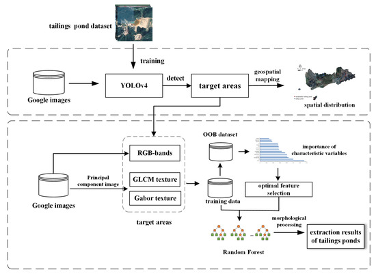 The flowchart of tailings pond extraction combining You Only Look Once (YOLO)v4 and random forest.