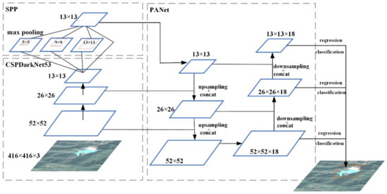 The YOLOv4 algorithm was proposed by Bochkovskiy in 2020 [33]. The architecture of YOLOv4 consists of CSPDarknet53, spatial pyramid pooling (SPP), path aggregation network (PANet) and YOLOv3 head [33]. The CSPDarknet53 is used as the backbone network to extract the features of the images. The SPP block is used to increase the receptive field [34] and the PANet is adopted to merge the extracted features [35]. When scaling the input image to a size of 416×416, the three scales of feature maps are obtained after sampling five times by CSPDarkNet53. The last feature map is disposed with 5×5, 9×9 and 13×13 maximum pooling operations and then the results are merged to obtain a 13×13 feature map. When processing the acquired 13×13 feature map and the first two 26×26 and 52×52 feature maps by the modified PANet structure, three scale predictive feature maps are obtained. Finally, by performing regression and classification operations on the predicted feature maps, the boundary coordinates and confidence of tailings pond are obtained. The main network structure is shown in Figure 2.
