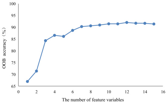 The importance ranking of the 15 features is shown in Figure 6. The variation in OOB accuracy (%) concerning the number of features used during random forest based extraction of tailings ponds is demonstrated in Figure 7. The OOB accuracy started to increase with the increase in the input features until reaching an optimum, after which it began to decrease. The OOB accuracy achieved 91.38% by using all the features. In contrast, the OOB accuracy achieved 92.03% by using 12 features. Therefore, the top 12 features were selected as the feature variables to obtain an optimal random forest model.