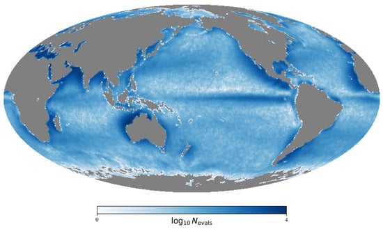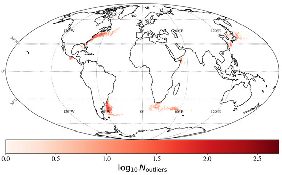 Of course, by requiring regions largely free of clouds (), we were significantly restricting the dataset and undoubtedly biasing the regions of ocean analyzed both in time and space. Figure 1 shows the spatial distribution of the full dataset across the ocean. The coastal regions show the highest incidence of multiple observations, but nearly all of the ocean was covered by one or more cutouts. Given this spatial distribution, one might naively expect the results to be biased against coastal regions because these were sampled at higher frequency and comprises a greater fraction of the full distribution. This is mitigated, in part, by the fact that the non-coastal regions cover a much larger area of the ocean, but in practice, we find that the majority of the outlier cutouts are in fact located near land.