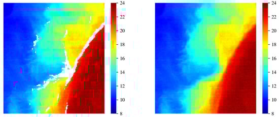 (left) Cutout which shows masking (white pixels) due primarily to sharp temperature gradients in this case, which tend to be flagged as low quality by the standard MODIS processing algorithm. (right) Same image but with masked pixels replaced by estimated values using the Navier-Stokes in-painting algorithm.