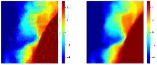 First, we mitigated the presence of clouds. As described in Section 2, this was done primarily by restricting the cutout dataset to regions with . We found, however, that even a few percent of cloud contamination can significantly affect results of the OOD algorithm. Therefore, we considered several inpainting algorithms to replace the flagged pixels with estimated values from nearby, unmasked SST values. After experimentation, we selected the Navier–Stokes method [15] based on its superior performance at preserving gradients within the cutout. Figure 2 presents an example that shows masking along a strong SST gradient (the white pixels between the red (∼22 C) and yellow (∼19 C) regions). We see that the adopted algorithm has replaced the masked data with values that preserve the sharp, underlying gradient without producing any obviously spurious patterns. As inpainting directly modifies the data, however, there is risk that the process will generate cutouts that are preferentially OOD. However, we have examined the set of outlier cutouts to find that these do not have preferentially higher CC.