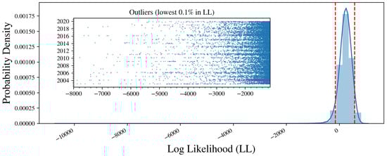 Distribution of LL values as a function of . While there is a strong anti-correlation, the relationship exhibits substantial scatter such that is not a precise predictor of LL nor the underlying SSTa patterns characterized by ULMO. The horizontal line at corresponds to the 0.1% threshold; cutouts with log-likelihood values beneath this line are considered to be outliers.