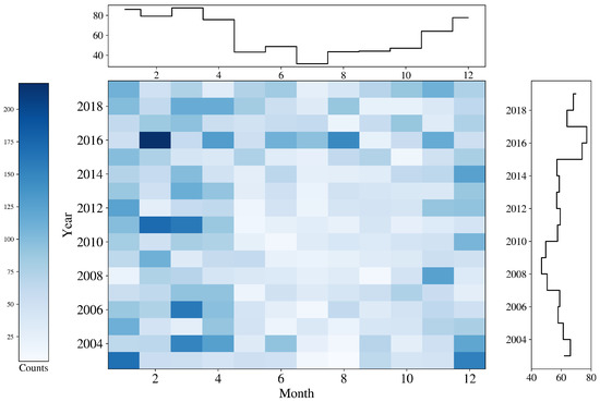 Incidence (counts) of outlier cutouts broken down by month and year. The primary feature is seasonal, i.e., a higher number of outlier cutouts during boreal winter months than summer. There was also a weak but plausible increase in the incidence of outliers over the past years.