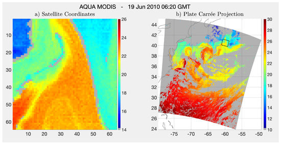 The 19 June 2010 cutout of Figure 7 with LL , in the lowest 0.1% of the log-likelihood values for the dataset. (a) The original cutout in satellite-coordinates prior to preprocessing. (b) The entire granule shown in a plate carrée projection with the continental boundary (dark gray) and the cutout (black rectangle). Note the change of palettes from (a) to (b) to accommodate the larger range of sea surface temperature (SST) in (b). Light gray are masked pixels, from clouds, land or clear pixels improperly flagged as cloud-contaminated (Section 2).