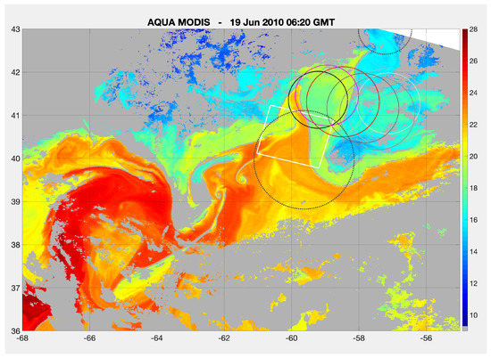 The SST field in the vicinity of the 19 June 2010 cutout of Figure 7. The cutout (white rectangle) is centered on 60W, 4130″N. Solid circles outline all observations of the anticyclonic eddy identified by Chelton et al. [19], which passed through the cutout on 19 June 2010. Circles are colored from light gray (1st detection of the eddy on 17 May) to black (last observation on 28 June) with the exceptions of its location shown in red on 14 June, immediately prior to the satellite overpass, and its location (magenta) one week later, 21 June, immediately following the overpass. Circles with dotted black outlines are anticyclonic eddies found in a broader search ( centered on 60W, 4130N) on 5 July, one week after the last observation of the eddy of interest. No cyclonic eddies were found in a similar search. Clouds are light gray.
