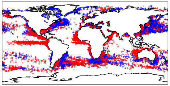 Spatial distribution of the LL/LL cutouts (red/blue) defined as the upper/lower tenth percentiles of the LL distribution for the set of cutouts with K. It is evident that these cutouts occupy distinct regions of the ocean; i.e., the ULMO algorithm has identified patterns with significant spatial coherence. More remarkably, note several areas (e.g., in the Brazil–Malvinas current) where one identifies adjacent but separate patches of LL and LL cutouts.