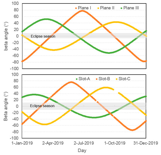 By December 2020, there were 49 BDS satellites in orbit; the status of the BDS constellation can be found at http://www.csno-tarc.cn/en/system/constellation (accessed on 30 December 2020). Among them, five GEO (C01–C05), seven IGSO (C06–C10 and C13), and three MEO (C11, C12, and C14) satellites form the basic constellation of BDS-2. Two MEO (C57 and C58) and two IGSO (C31 and C56) satellites from the BDS experimental constellation (BDS-3s) are set as unhealthy. Moreover, BDS-3 consists of three GEO (C59, C60, and C61), three IGSO (C38, C39, and C40), and twenty-four MEO (the rest) satellites. Unlike all BDS-2 satellites and BDS-3 IGSO/GEO satellites developed entirely by the China Academy of Space Technology (CAST), BDS-3 MEO satellites are built by two different manufacturers, i.e., CAST and Shanghai Engineering Center for Microsatellites (SECM). BDS MEO satellites are distributed in three orbital planes, i.e., Slot-A (C11, C12, C27–C30, C34, C35, C43, C44), Slot-B (C14, C19–C22, C32, C33, C41, C42), and Slot-C (C23–C26, C36, C37, C45, and C46), whereas the BDS IGSO satellites also orbit in three planes, i.e., Plane I (C06, C09, C16, C39), Plane II (C07, C10, C40), and Plane III (C08, C13, C41). Figure 1 shows the variation of elevation angle of the sun above the six orbital planes (β angle) from day of year (DOY) 1 to 365, 2019, which is the selected study period in this contribution. For IGSO satellites, the orbital planes II and III show smaller variations than that of orbital plane I: the satellites will cross eclipse seasons for |β| < 9°. While, for MEO satellites, Slot-A orbital plane has relatively larger variations followed by Slot-C and Slot-B. When |β| < 13.2°, the orbital planes are partially eclipsed.