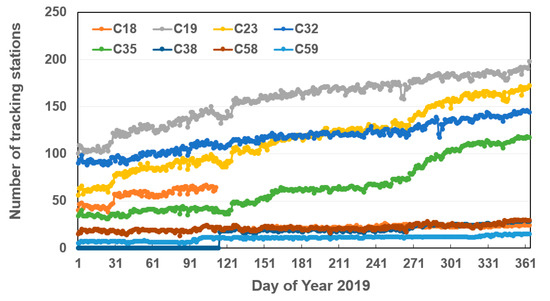 The number of stations with tracking capacity of the BDS-3 representative satellites, i.e., C19, C23, C32, C35, C38, and C59 satellites from DOY 1 to 365, 2019.