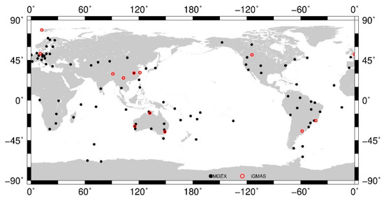 Distribution of the ground stations used for estimating PCOs and phase center variations (PCVs) of BDS IGSO and MEO satellites. Red circles indicate International GNSS Monitoring and Assessment System (iGMAS) stations, whereas the black ones represent International GNSS Service (IGS) multi-GNSS experiment (MGEX) stations.