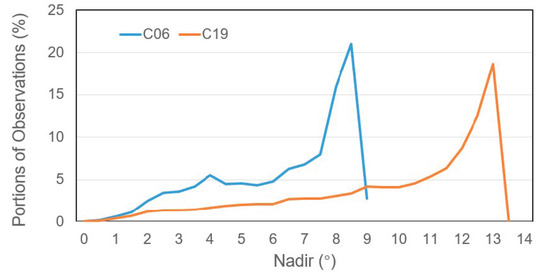 Distribution of observations with respect to the satellite nadir angle for representative IGSO C06 and MEO C19 satellites.