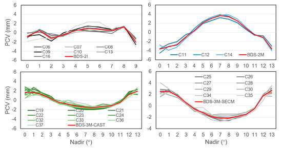 As mentioned above, PCVs and PCOs were estimated in two steps. For the estimation of PCV values, we first obtained the daily raw PCVs with the PCOs fixed. Afterwards, the daily raw PCVs were then converted to daily smooth PCVs. With comprehensive quality control as well as an averaging algorithm, the satellite-specific and satellite-block-specific PCV values were obtained and plotted in Figure 5 for BDS-2 IGSO, BDS-2 MEO, and BDS-3 MEO from CAST and SECM, respectively.