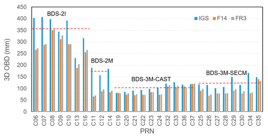 We also observed that the OBDs were reduced by about 55.0% from 176.6 mm to 79.5 mm for BDS-2 MEO, whereas the reduction for BDS-2 IGSO was about 21.7% from 356.0 to 278.9 mm. With respect to the approximate 13.2% reduction for BDS-3 CAST MEO satellites, the OBDs were reduced by 30.9% for BDS-3 SECM satellites, making 3D OBD achieve around 90.0 mm for both kinds of MEO satellites. In addition, we also observed that the OBD reduction was smaller for C35-C37 than that of others, possibly due to fewer ground stations available in the process of estimating PCC and precise orbit determination.