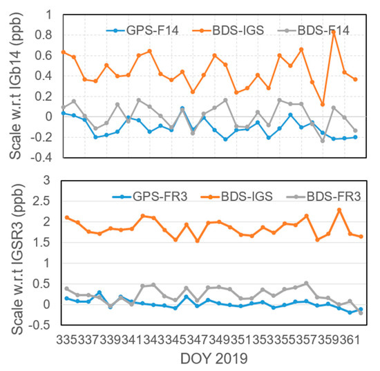 A BDS-only precise point positioning (PPP) was performed using the three sets of daily orbit and clock parameters from the global network solutions determined in the last subsection. Furthermore, two sets of GPS-only PPP were also performed with the orbits and clocks determined within IGb14 and IGSR3 frame, respectively. The daily station coordinates, hourly constant tropospheric zenith pass delay, carrier phase ambiguities and epoch-wise receiver clocks were solved. Coordinatingly, three BDS-only (BDS-IGS, BDS-F14, and BDS-FR3), as well as two GPS-only solutions (GPS-F14 and GPS-FR3), were obtained. The seven-parameter Helmert transformations were carried out to compare the BDS-IGS, BDS-F14, and GPS-F14 PPP-derived coordinates with the IGS legacy daily final estimates in IGb14 frame, whereas the GPS-FR3 and BDS-FR3 solutions were compared to the initial combined coordinates of the third IGS reprocess, available at ftp://igs-rf.ign.fr/pub/repro3_tests/2008-2019/IGS1R03TST/ (accessed on 30 December 2020), with Helmert transformations. The scale parameters obtained from the Helmert transformations gave the assessment of consistency of the GPS- and BDS-derived station heights with respect to IGb14 as well as IGSR3 frame. The scale bias between the GPS- and BDS-only PPP coordinates and the IGb14 and IGSR3 reference frame are shown in Figure 7.
