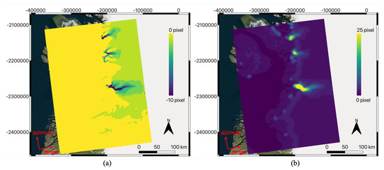 Without the help of a downstream search routine, a very large search distance is required for fast-flowing ice surfaces, especially for the current test site. From recent studies, the maximum velocity of the Jakobshaven glaciers has been found to be around 15 km/year, with an overall seasonal range of 8 km/year [40]. We therefore used a search range of pixels in range and pixels in azimuth. An oversampling ratio of 64 was used for the sub-pixel program.