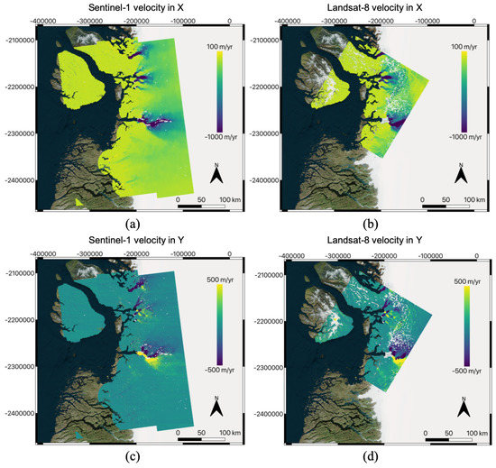 Velocity output of the autoRIFT module for the Sentinel-1 pair and the Landsat-8 pair with the best coverage in this work: (a) Sentinel-1 velocity in X direction, (b) Landsat-8 velocity in X direction, (c) Sentinel-1 velocity in Y direction, (d) Landsat-8 velocity in Y direction. The colorbar unit is in m/year in all of the subfigures. The Sentinel-1 pair is 20170404–20170410, and the Landsat-8 pair is 20170718–20170803, as identified in Table 2 with the highest ROI coverage.
