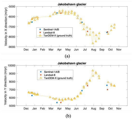 Comparison of the velocity time-series estimates of the Sentinel-1 and Landsat-8 data in this work against the ground-truth data (TanDEM-X) over the fast-moving glacier outlet as marked in Figure 3: (a) velocity in X direction, (b) velocity in Y direction.