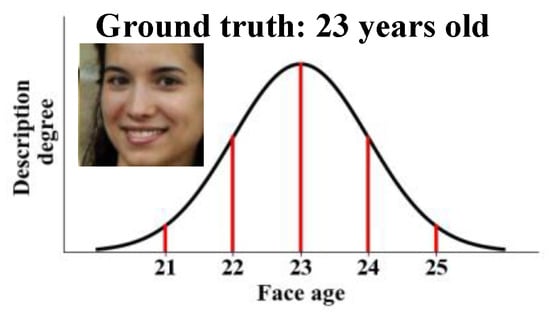 - The widely used label distribution is Gaussian smoothing from the sample ground truth to close labels [,,,,], as shown in Figure 1. For the age images, local sample similarity is known, i.e., similar images have close ages; also, global label correlations are available, i.e., the age difference reflects label correlations. The Gaussian distribution properly models the label ambiguity because both the local similarity and label correlations are captured.