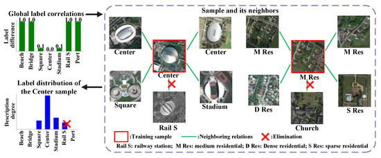 The third type is the adaptive label distribution [,,,] which aims to enhance the adaption to data variations. Among the methods for adaptive label distributions, the data-dependent LDL (D2LDL) [] has the potential to be transformed into scene classification problems, which models label ambiguity regarding human age though sample neighbors and the label distributions are computed as label propagation. D2LDL adopts subspace learning to compute the sample affinity graph and the coefficient matrix is constrained by the norm to obtain sparse neighbors. Compared to the Gaussian distribution, D2LDL is more flexible for data variations. However, D2LDL only captures local similarity through the norm but overlooks label correlations, which may cause neighbors conflicting with label correlations and thus produce label noise, as explained in Figure 2.