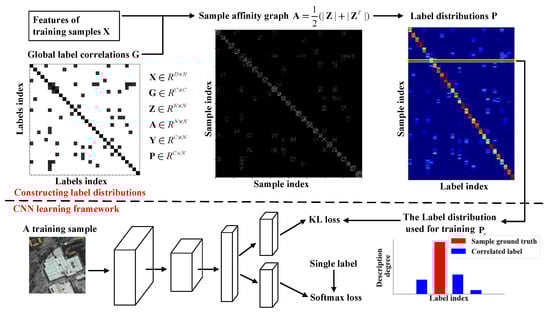 We define a subspace learning problem to model the label ambiguity of aerial images. As shown in Figure 3, the constructed label distributions are used for CNN training. At the testing stage, predictions are determined by the fully connected (FC) layer that is connected to the single truth label.