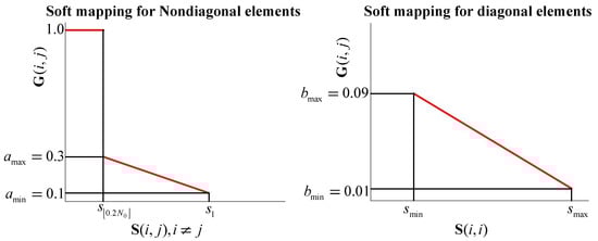Denote the confusion matrix as , where element denotes the rate at which samples of label i are classified as label j. According to Wang et al. [], the symmetric similarity matrix is computed as . A large implies a similar label pair . In this paper, label pairs that are in the top 20% in terms of similarity are regarded as correlated labels. Specifically, we sort all the non-diagonal elements of S as a descending sequence and delete the repeated values from the sequence. This leads to a sequence , in which implies the most similar label pair. Labels i and j are thought of as correlated if , where the function denotes the rounding down operator. Denote the maximal and minimal values in the classification accuracies as and , respectively. Since the role of G is to express label differences, should be inversely proportional to . Soft mappings are defined to compute G, as illustrated in Figure 4. Elements of G are computed as follows:
