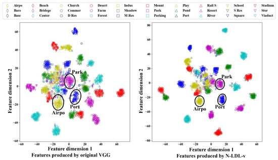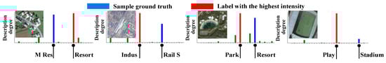 Aerial scene classification aims at classifying each aerial image into a scene label, which is typically cast as a single label learning (SLL) problem. Convolutional neural networks (CNNs) have been acknowledged as the most powerful approach for aerial scene classification [,]. The fact that some aerial scenes share similar appearance or objects causes the label ambiguity of aerial image. Some References [,,] handle the label ambiguity through multi-label learning (MLL). Both SLL and MLL aim to answer the question ‘which label can describe the sample?’. Different from SLL or MLL, label distribution learning (LDL) [,] handles the more ambiguous question ‘how much does each label describe the sample?’. For a sample, its label distribution represents the degree to which each label describes the sample. In this way, samples are associated with multiple labels, and a sample can contribute to not only the learning of the ground truth, but also the learning of correlated labels. Thus, each label is supplied with more training data. Using label distributions to express label ambiguity can boost CNN learning by improving data utilization [,,,,].