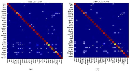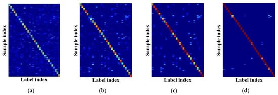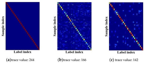 The label representations produced by N-LDL possess low trace values and can capture intrinsic label correlations. Literatures related to IncomLDL [,] and MLL [,] have proven that label representations considering label correlations contribute to improving classification performance. On the basis of low-rank assumption, a trace norm can be imposed on label representations to capture intrinsic label correlations []. Thus, the optimized label representations possess low trace values and can improve classification performance. Loosely speaking, label representations with low trace values enjoy strong ability to express label correlations. Figure 17 and Table 6 present the trace values of different label representations. From Table 5, the sample truth labels (i.e., Y) had the largest trace values due to the ignorance of label correlations. In contrast, N-LDL achieved the lowest trace values and thus can express label correlations sufficiently, which leads to the high OA, as listed in Table 3.