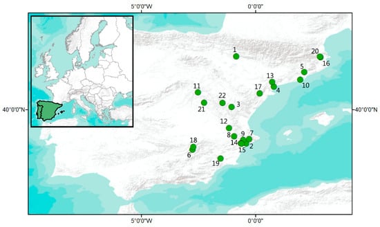 We used a previously developed dataset, selecting the annual tree-ring width series of 22 Aleppo pine forest stands covering a wide range of environmental conditions across the Iberian Peninsula (Figure 1 and Table 1). Site selection was based on the homogeneity of the forestland cover and soil conditions (marls and limestone) at the sampled sites [48]. In each forest site, a total number ranging from 15 to 40 dominant or co-dominant Aleppo pine trees, separated by at least 10 m, with no obvious signs of damage or disease, were sampled. Trees were cored at 1.3 m height, at two perpendicular directions, using Pressler increment borers.