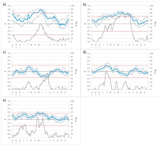Temporal evolution of the R median (blue continuous line), its 25th and 75th percentiles (blue dashed lines) and the moving average of the percentage of significant (p-value < 0.05) cases (gray line) from the comparison between the daily moving window averages of 30 days for (a) Climate Change Initiative (CCI), (b) Lisflood (LF), (c) Tmax, (d) Tmin, and (e) precipitation, and TRI series. Asterisks correspond to data from the previous year, and the red lines correspond to the significance threshold (p-value < 0.05).
