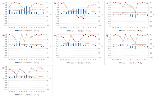 Monthly median correlation coefficients between the monthly time series of (a) CCI, (b) LF, (c) Tmax, (d) Tmin, (e) precipitation, (f) PET, and (g) SPI-1, and TRI series (blue bars), percentage of significant (p-value < 0.05) cases (red dots), and standard deviation of the results from the 22 tree samples (orange line). Asterisks correspond to data from the previous year.