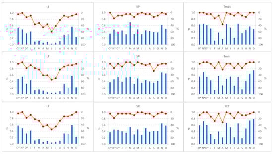 Monthly results from the multiple linear regression analysis for LF, SPI, and Tmax (first row), LF, SPI, and Tmin (second row), and LF, SPI, and PET (third row), respectively. Blue bars correspond to the median p-values and red dots corresponds to the percentage of significant results (p-value < 0.05). Asterisks corresponds to data from the previous year.