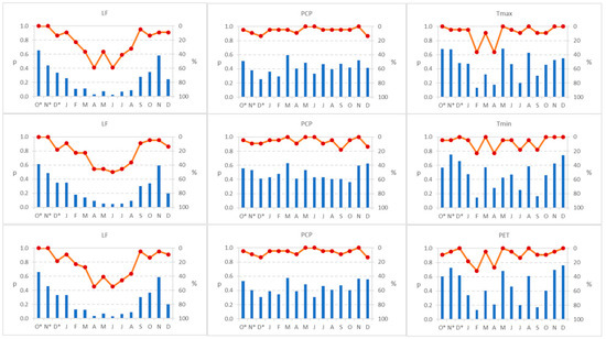 Monthly results from the multiple linear regression analysis for LF, precipitation, and Tmax (first row), LF, precipitation, and Tmin (second row), and LF, precipitation, and PET (third row). Blue bars correspond to the median p-values and red dots corresponds to percentage of significant results (p-value < 0.05). Asterisks corresponds to data from the previous year.